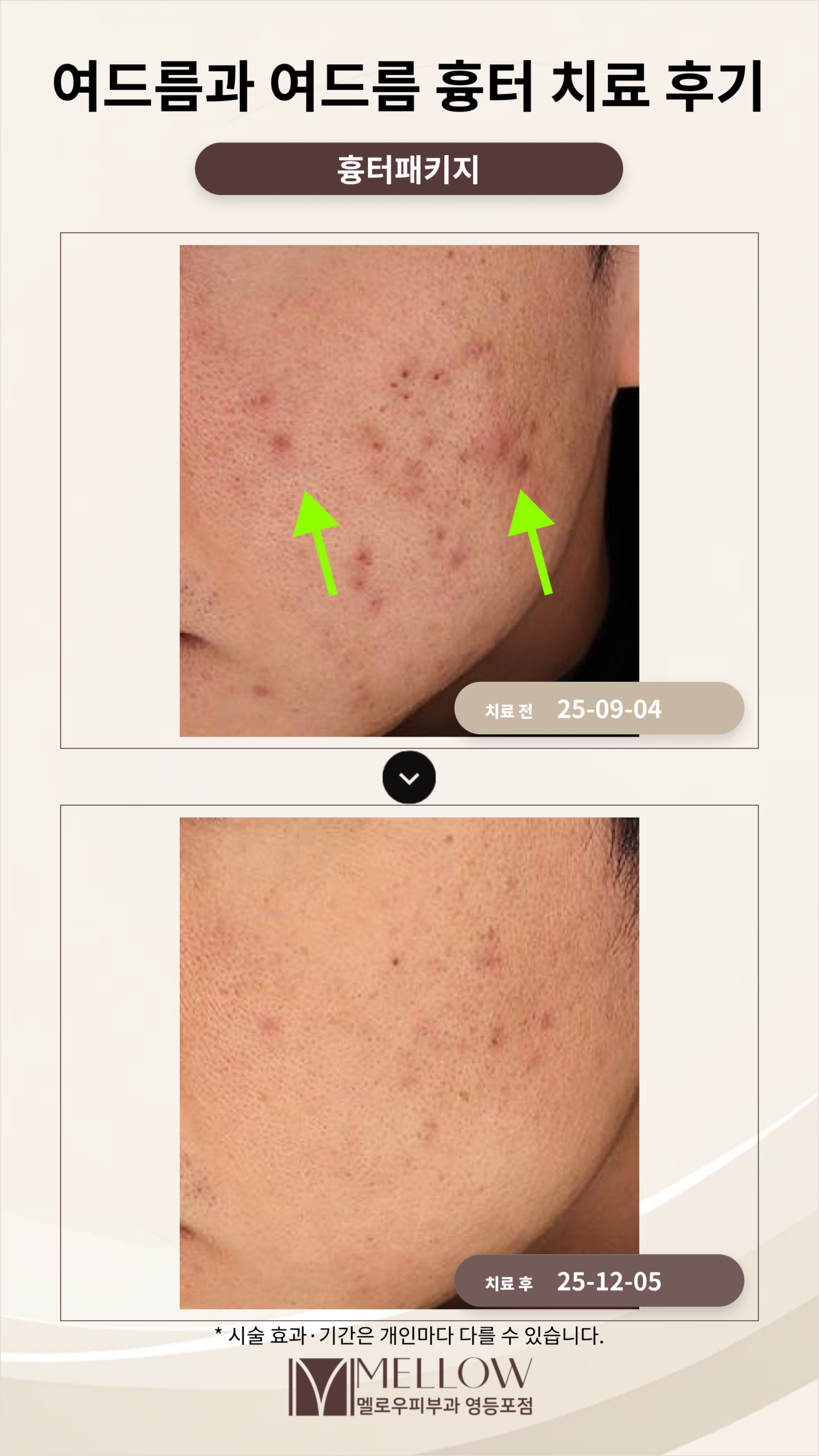 흉터패키지 시술 후에는 다양한 종류의 흉터가 전반적으로 개선됩니다. 흉터의 크기, 깊이, 색소침착 등이 완화되어 피부결이 한층 부드러워지고 균일해지는 것을 기대할 수 있습니다.